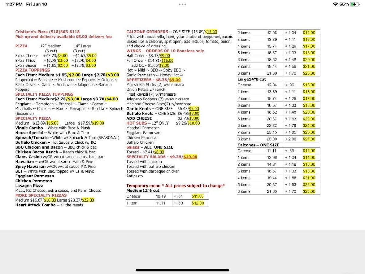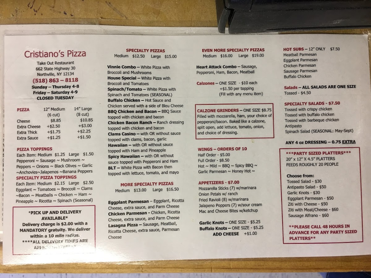 Welcome to Cristiano's Pizza, a hidden gem located at 662 NY-30 in Northville, NY. This delightful pizza joint offers a menu that excites and surprises with its unique flavors and hearty combinations. Renowned for their Vinny Special, a white pizza topped with broccoli and mushrooms, customers rave about the crispy, airy crust that enhances every bite. The garlic knots are also a must-try, with rave reviews praising their taste and texture.